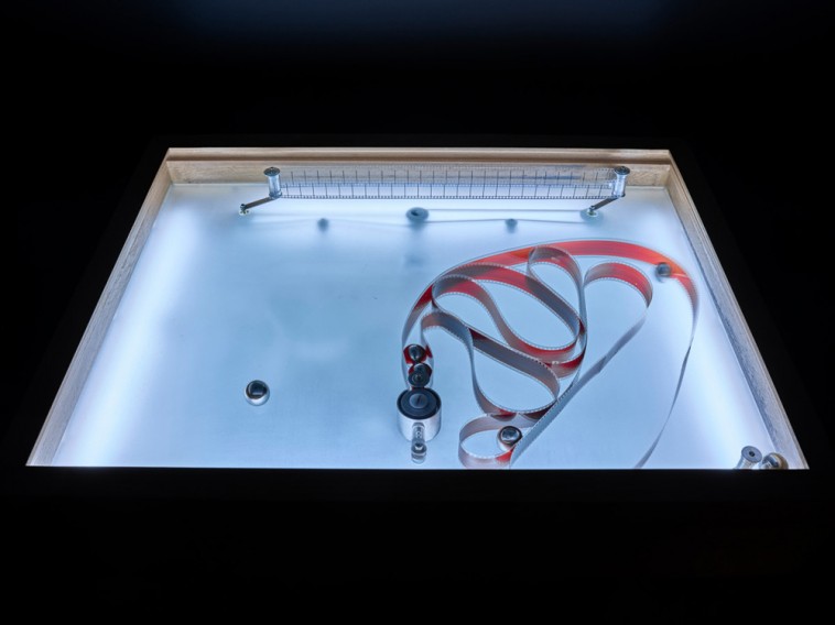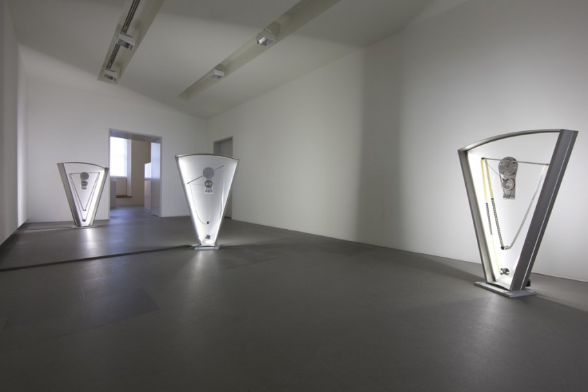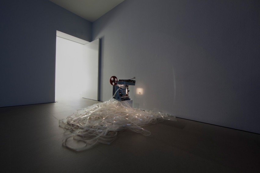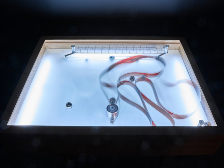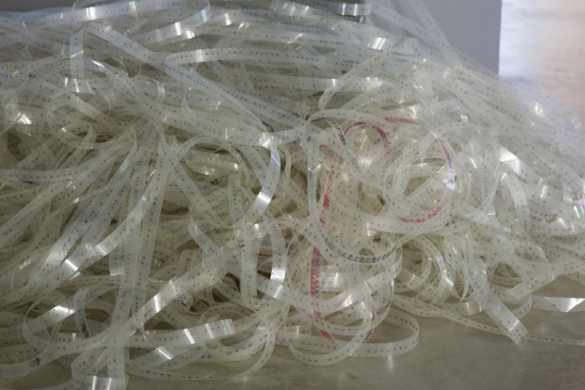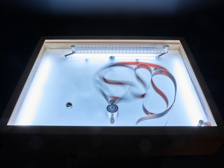 Three film sculptures: 35mm film, motors, aluminum, Plexiglas