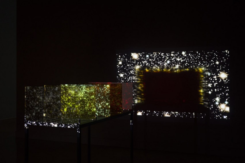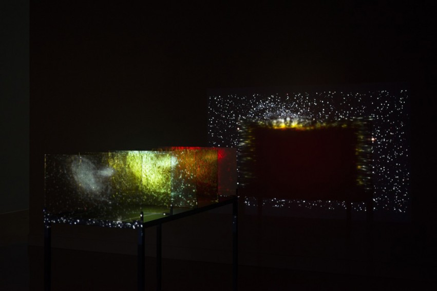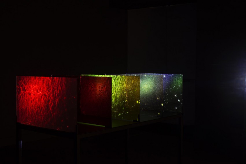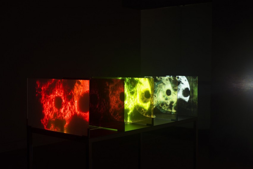 HD video (color, sound), 5 colored glass filters, steel base table, installation dimensions variable, 36 min