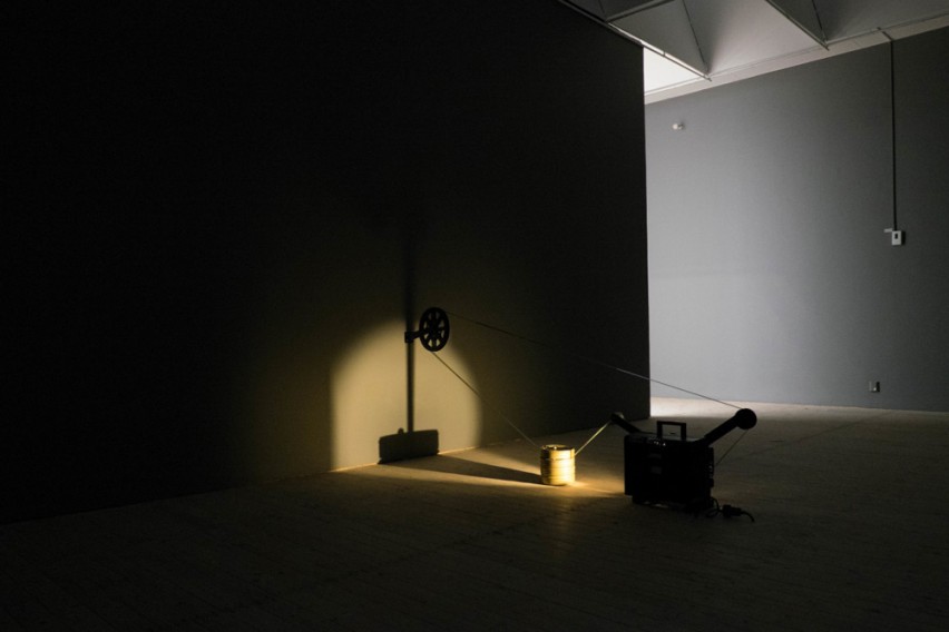 Transparent 16 mm film, modified projector, film canisters, 2 metal spheres