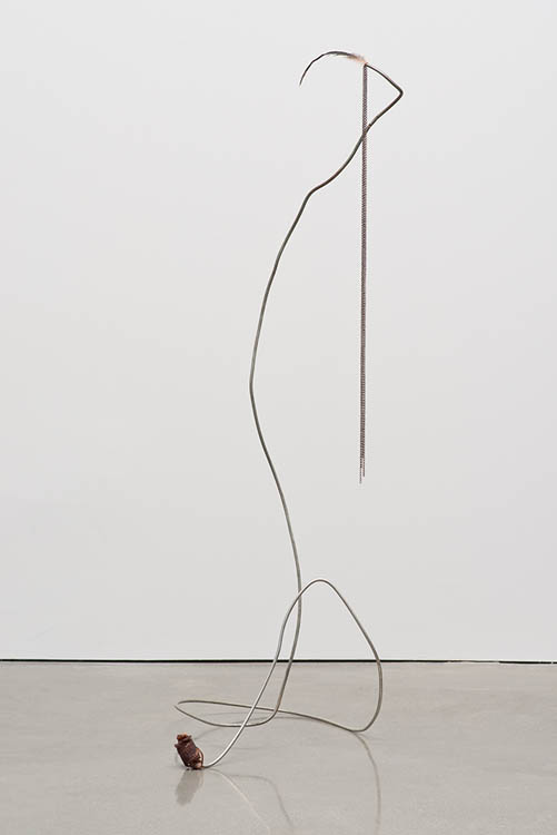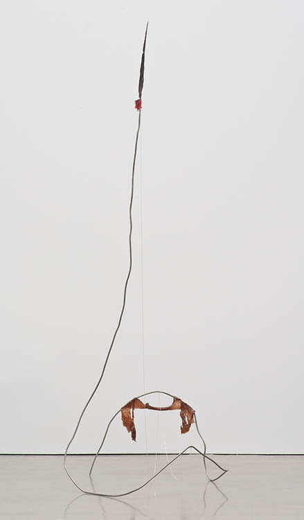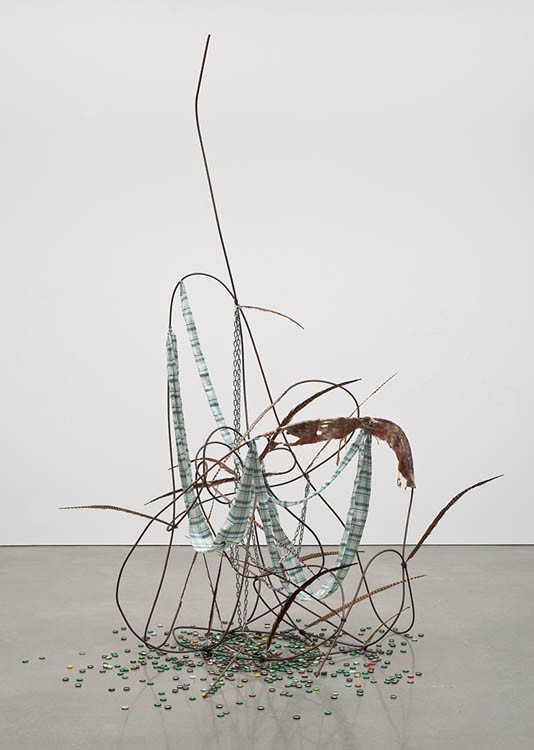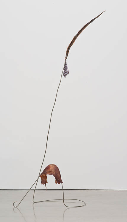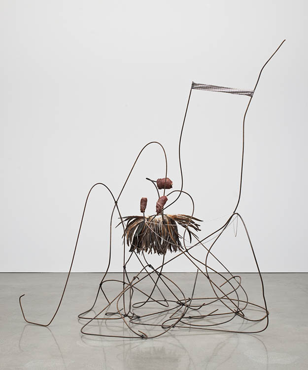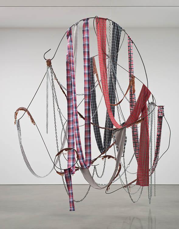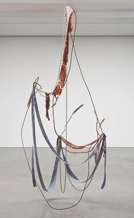Rebar, fabric, feathers, chain, and meat