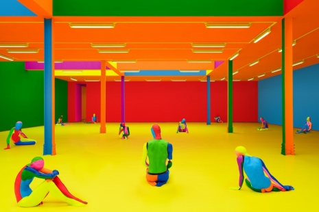 oil, acrylic, ink and flashe on burlap in reclaimed wood frame installed dimensions: 241.8 x 683 x 8 cm (95 1⁄4 x 268 7⁄8 x 3 1⁄8 in)