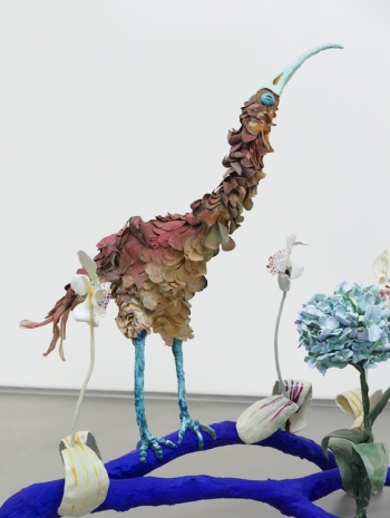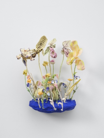 Wood, grout, fabric, acrylic paint, resin, polymer clay, metal, wire