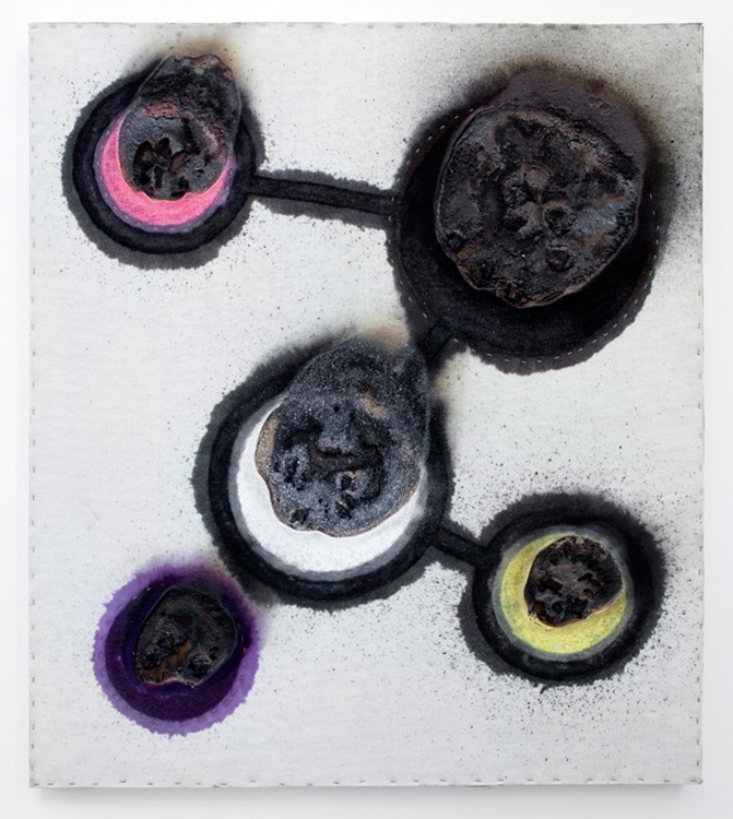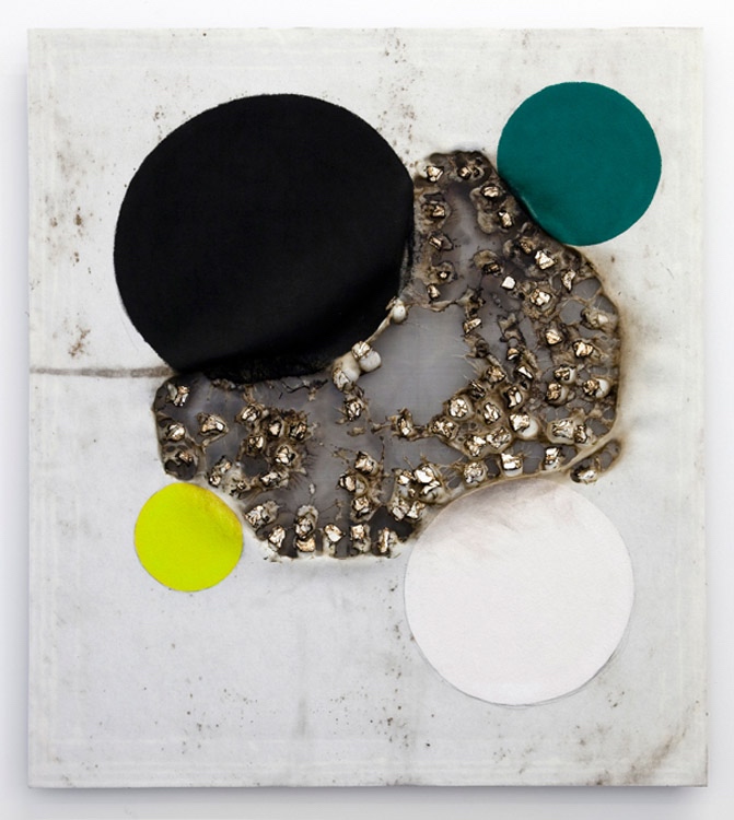 Wood, stainless steel woven mesh, felt, Teflon fabric, spray-paint, paraffin wax fire briquettes