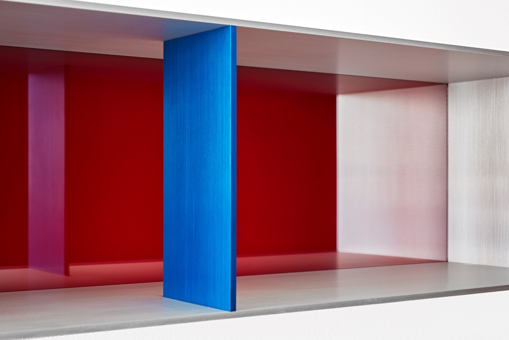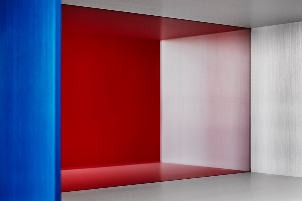 Clear and turquoise anodized aluminium with transparent blue over red acrylic sheets