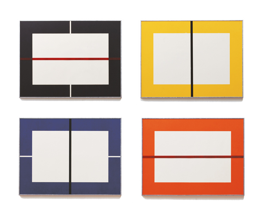 Set of four woodcuts printed in black, orange, yellow and ultramarine blue and with an oil paint stripe on the class of each galvanized iron frame. Japanese paper